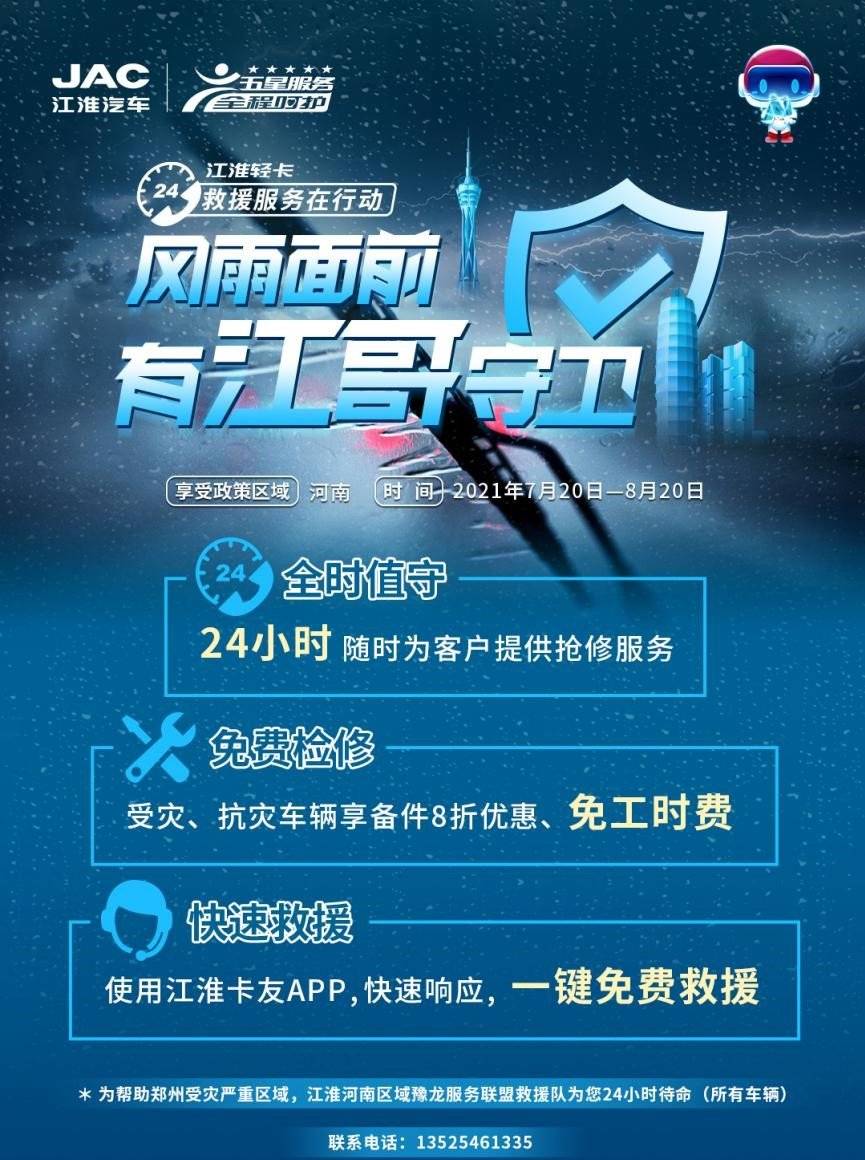 水災(zāi)無情人有情,面對此次突發(fā)的河南水災(zāi),江淮輕卡在組織全國各地服務(wù)站救援隊伍搶險救災(zāi)的同時,還為賑災(zāi)支援車輛提供綠色通道服務(wù),優(yōu)先保障賑災(zāi)車輛服務(wù)工作;區(qū)域服務(wù)商24小時值守,隨時為客戶提供搶修服務(wù),無條件優(yōu)先響應(yīng),即呼即到;服務(wù)商成立救援小組參與社會救援,免費(fèi)救援、免費(fèi)提供應(yīng)急餐飲支持;針對洪災(zāi)需要救援的車輛,服務(wù)商實施免外出費(fèi)救援政策。